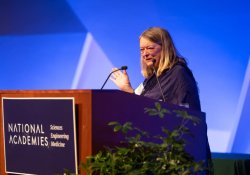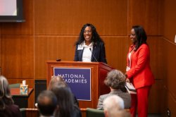 Two men in dark suits seated on a stage next to a podium with a sign that reads National Academies.